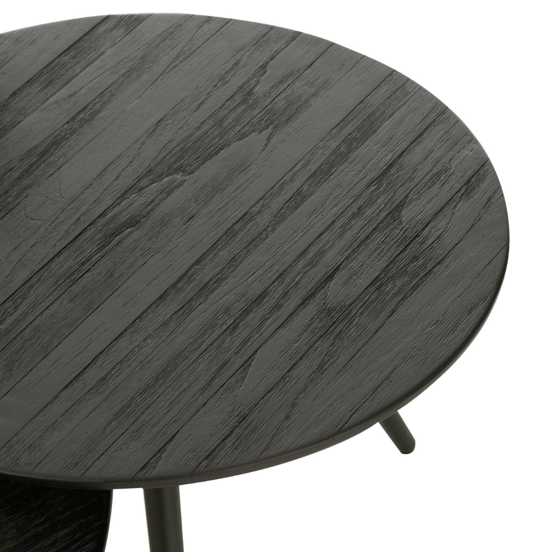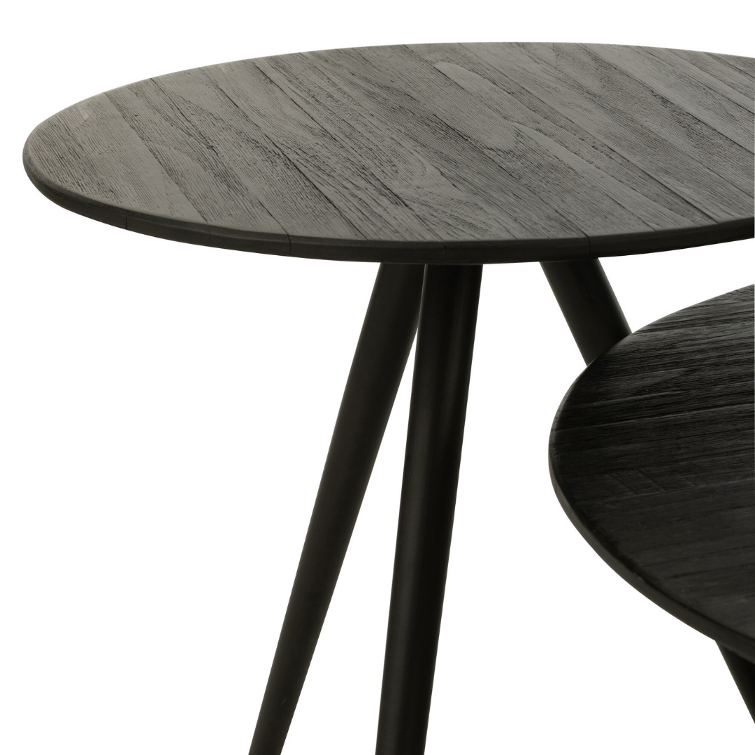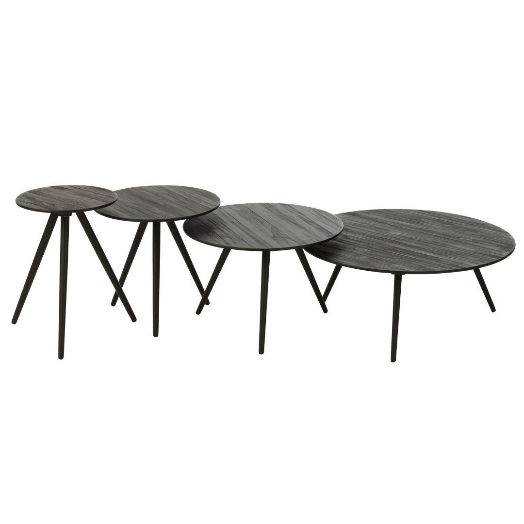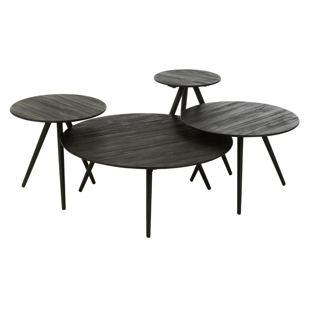 A Journey kollekció része ez a négy különböző méretű darabot tartalmazó, stílusos lerakóasztal szett, amely tökéletes kiegészítője lehet bármely nappalinak. A fekete szín eleganciát és kifinomultságot kölcsönöz neki, míg a tikfa lap természetes melegséget és karaktert ad hozzá. A masszív fém lábak biztosítják a stabilitást és tartósságot, miközben modern megjelenést biztosítanak. Az asztalok méretei: Ø30x45 cm, Ø40x40 cm, Ø50x35 cm, és Ø70x30 cm.