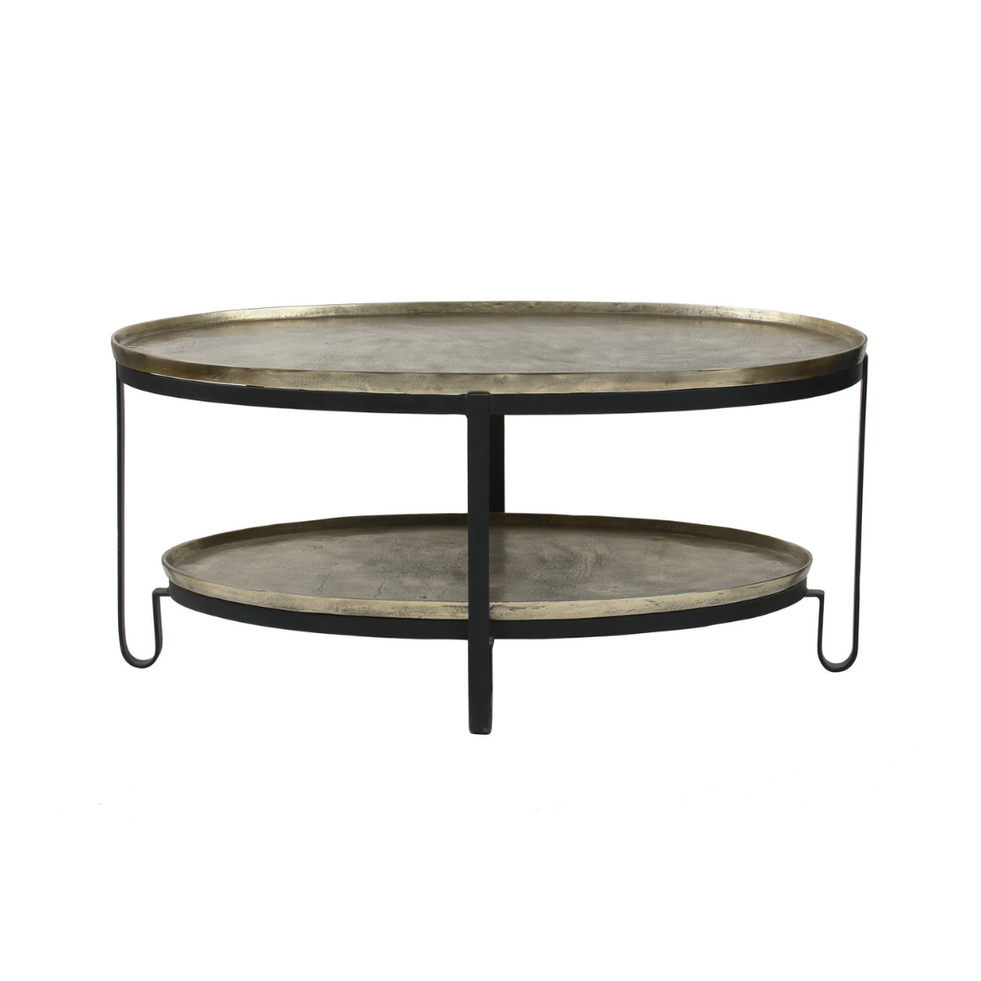 Az antikolt arany színű lapokkal rendelkező Kae dohányzóasztal peremes kialakításával, és ovális formájával tűnik ki. A keretes fekete fém váz modern hangulatot, és könnyedséget áraszt, miközben stabil alapot nyújt. Az alumíniumból készült termék hosszú élettartammal bír, és a polcnak köszönhetően elegendő tárolóhelyet biztosít.