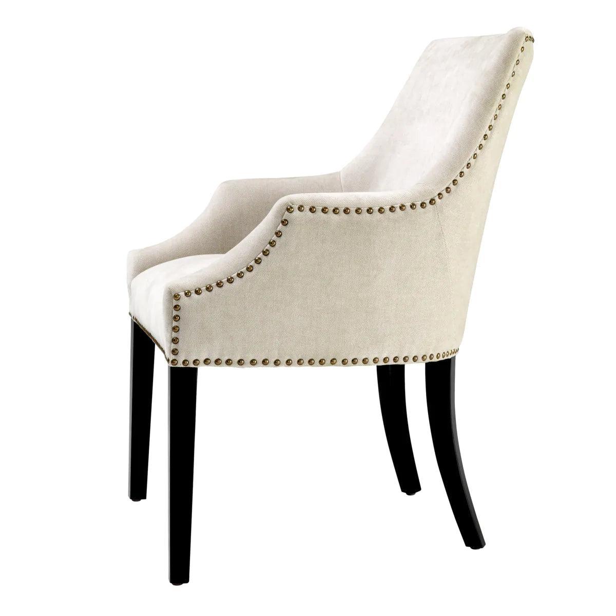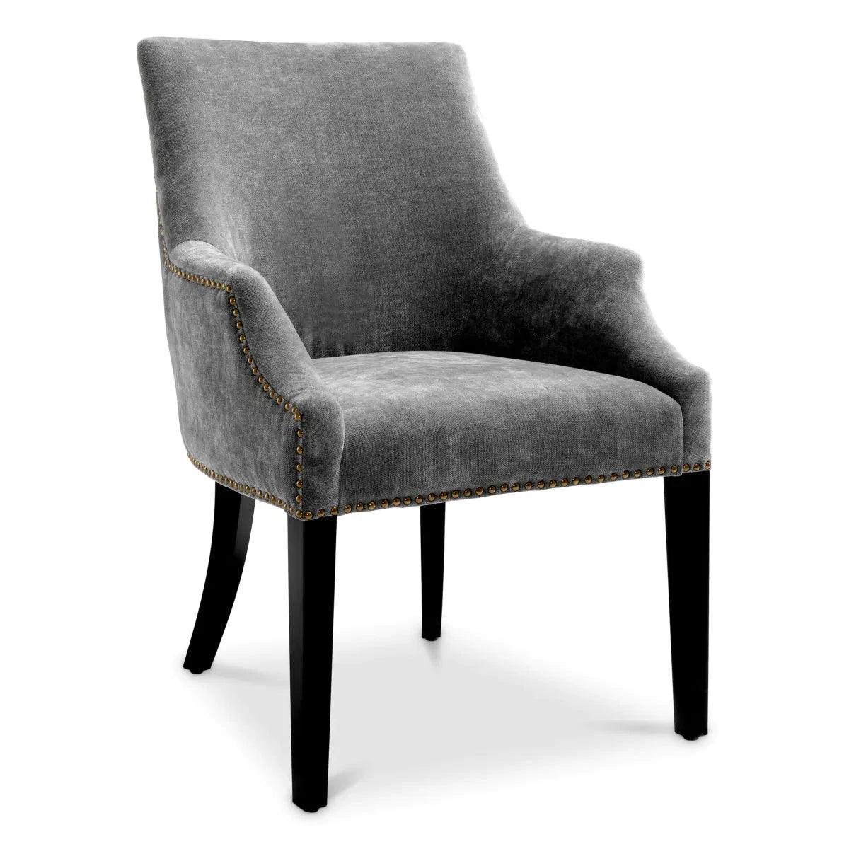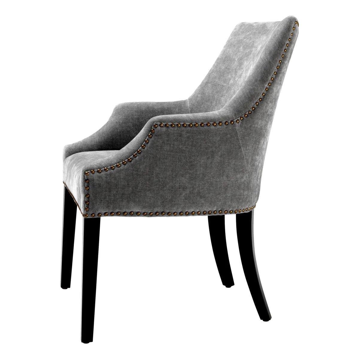 Adj stílusos kényelmet étkeződnek a Legacy étkezőszékkel. Ez a szék elsöprő formájú, és Clarck kárpittal rendelkezik, amely antik sárgaréz szögekkel tűzdelt. A karcsú fekete széklábak teszik teljessé a luxus megjelenést.