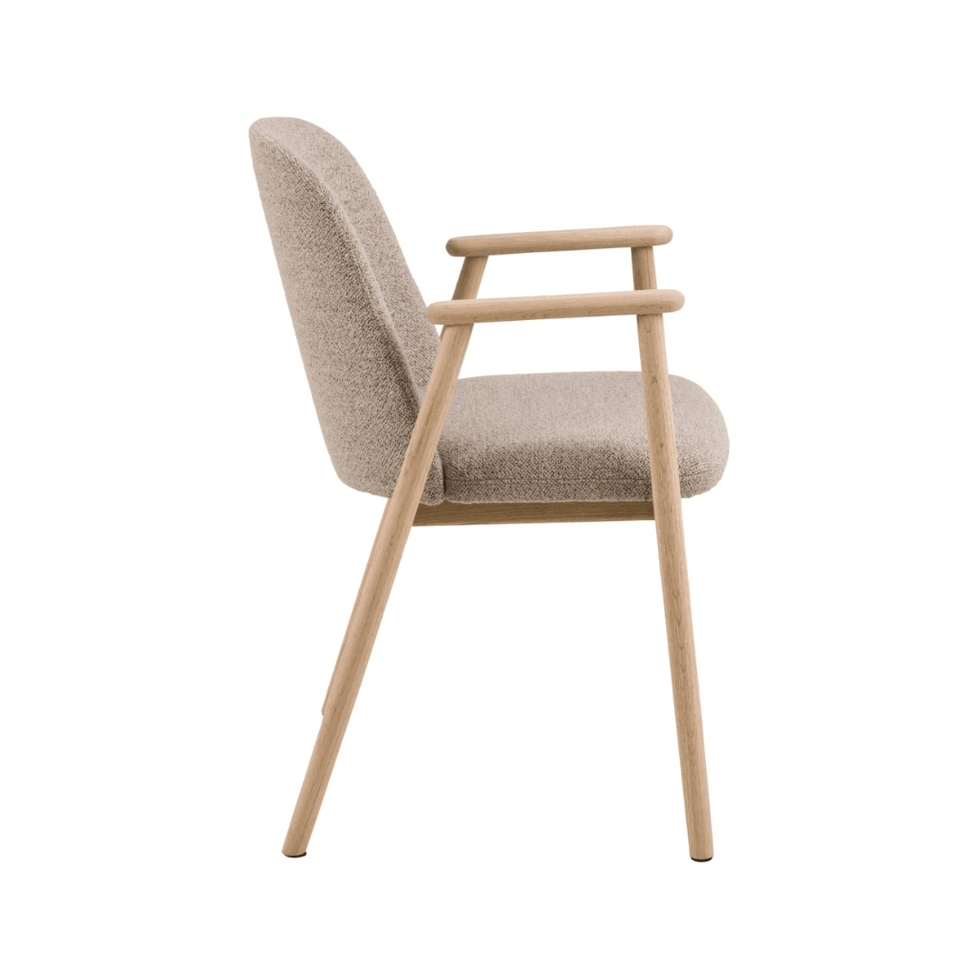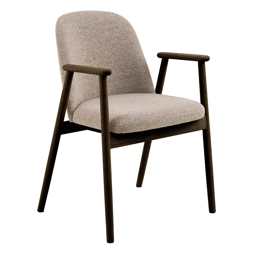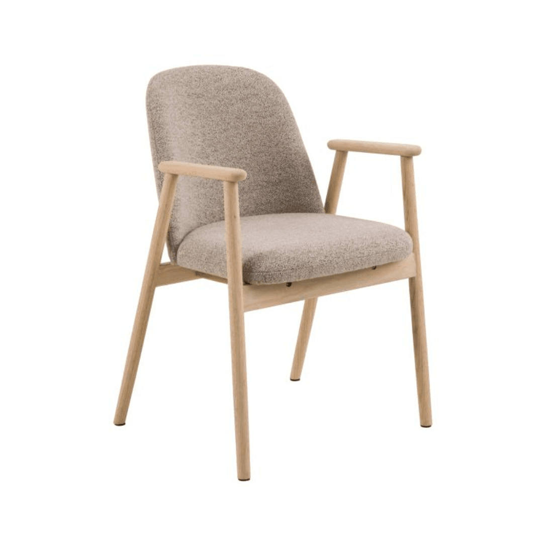 A Leo karfás étkezőszék esztétikus skandináv eleganciát kölcsönöz az étkezőnek. Az ülés bézs színű bouclé anyaggal kárpitozott, melynek szerkezete a modern, mégis elegáns érzés érdekében készült. A karcsú lábakkal megtámasztott szék szoborszerű kialakítású, a tölgy pedig kiemeli a skandináv stílust. Párnázott ülése és karfái miatt a hosszú időn át tartó használat is kényelmes marad.