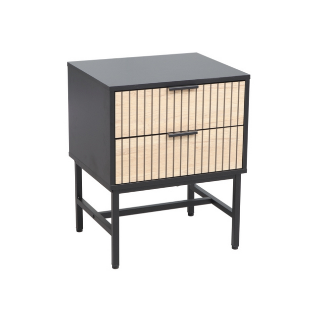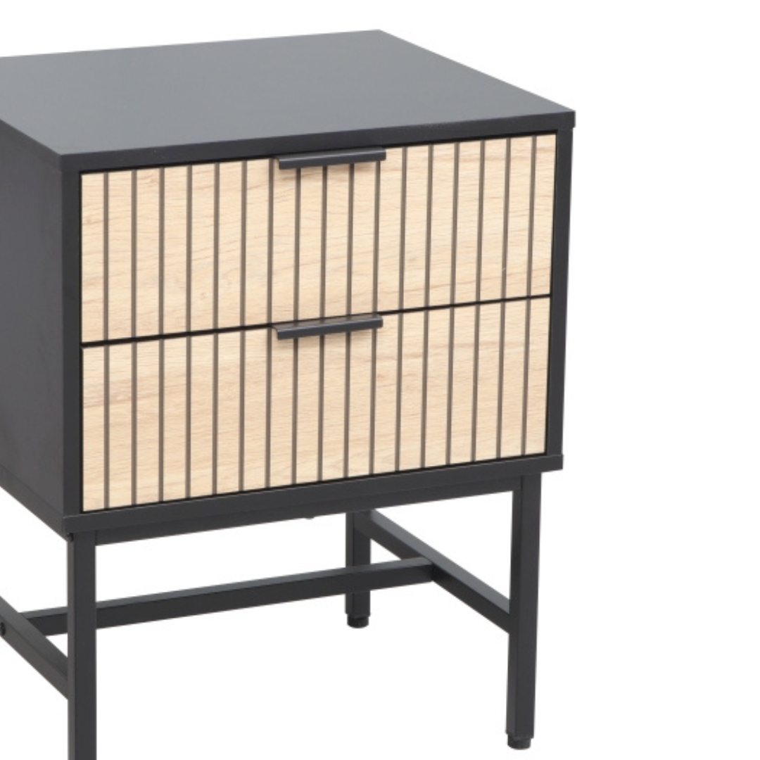 A fém lábakon álló Mago éjjeliszekrény egy modern bútordarab, mely fekete keretével, és bordázott, natúr színű előlapjaival kiemelkedik minden térben. Két fiókja praktikus tárolóhelyet biztosít, míg kompakt mérete lehető teszi, hogy kisebb hálószobákban is kényelmesen elférjen az ágy mellett.