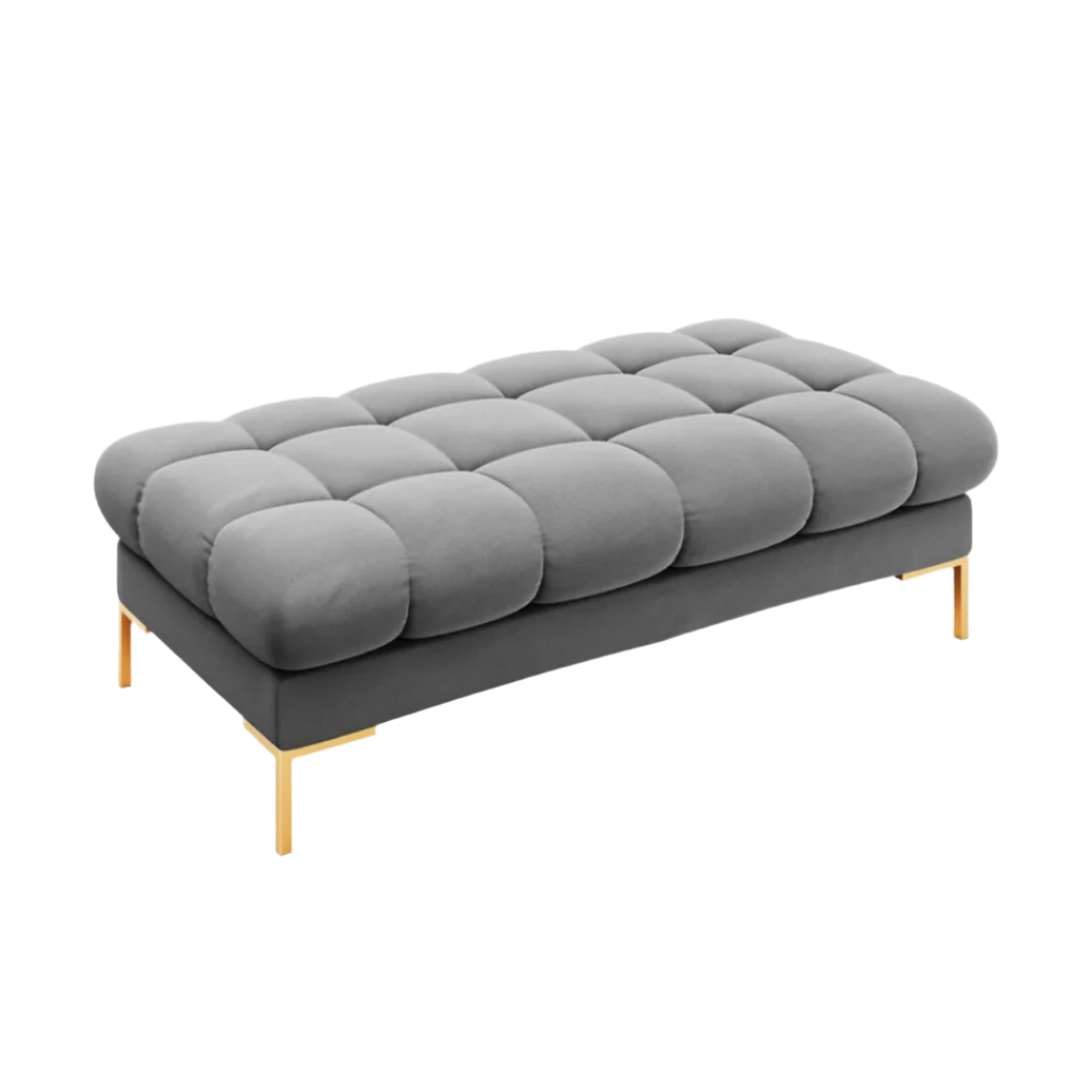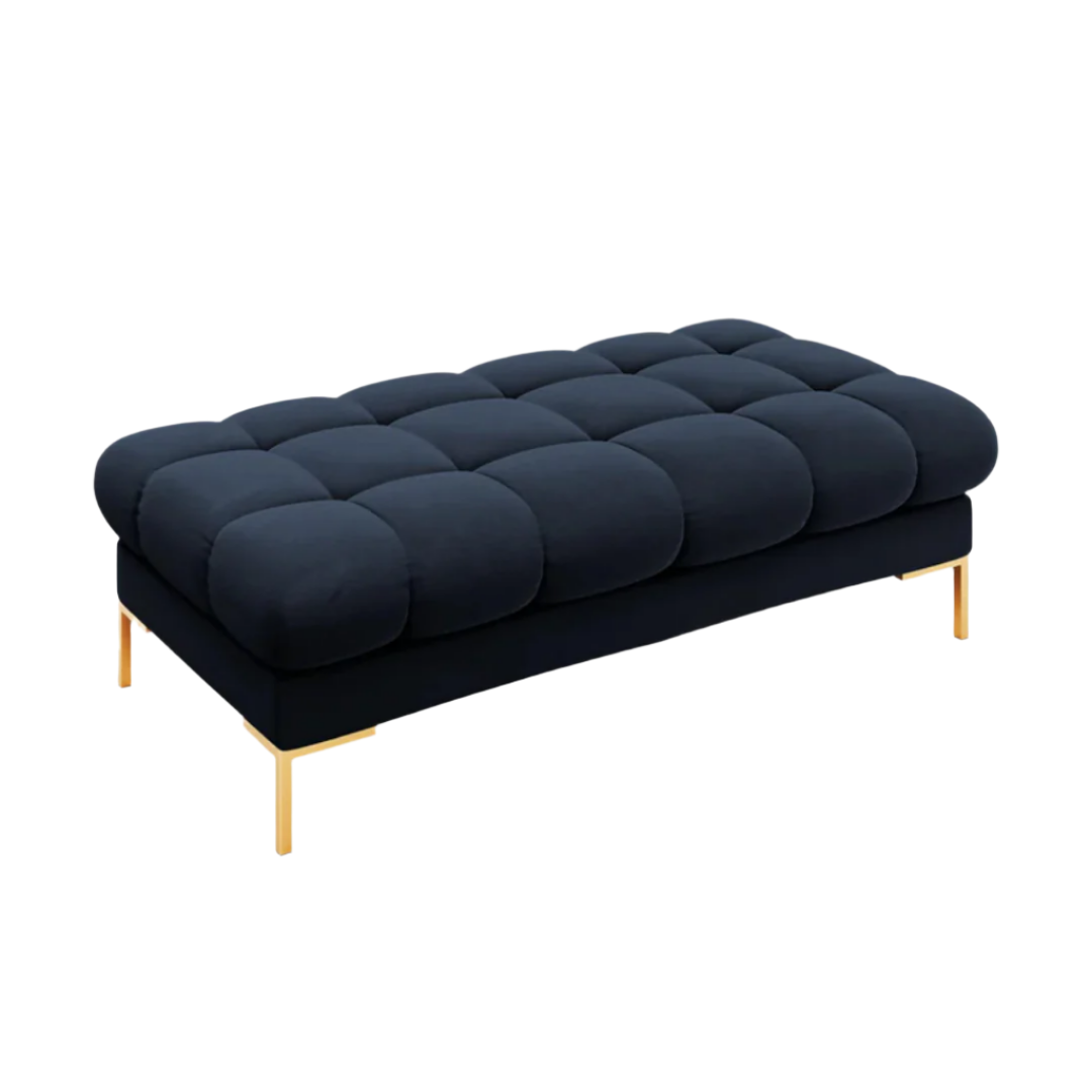 A felület gondos foltvarrásával a Mamaia kollekció egyedi, jellegzetes és dinamikus energiával tölt meg minden belső teret. A pad dekoratív kialakítása nagyon stílusos hatást kelt. A gyönyörű színű bársony kárpitok és a geometrikus arany színű fémlábak a modernitás és az elegancia ötvözete. Lábtartóként, és extra ülőhelyként is tökéletes lehet a Mamaia ülőgarnitúrák kiegészítőjeként.