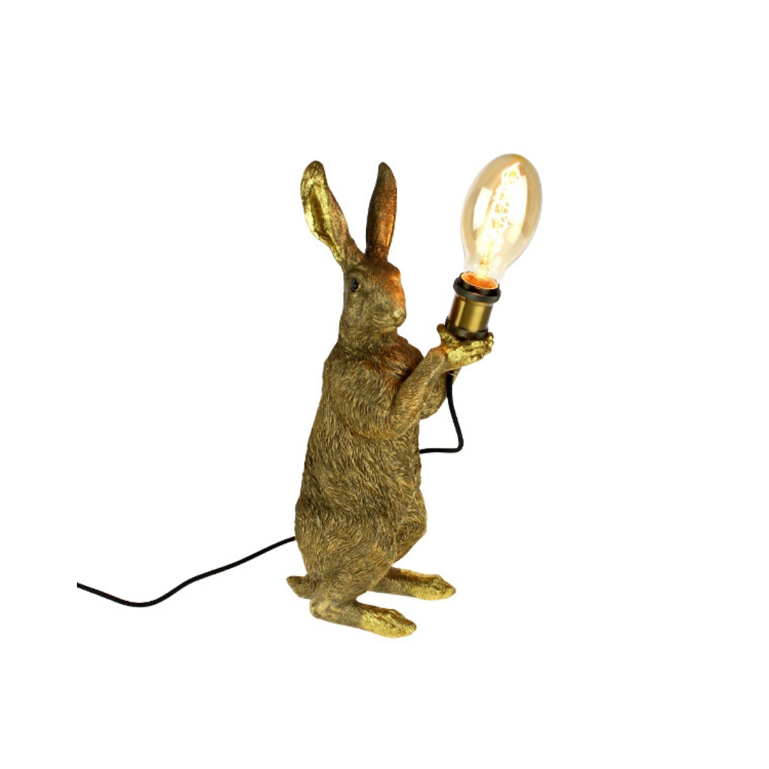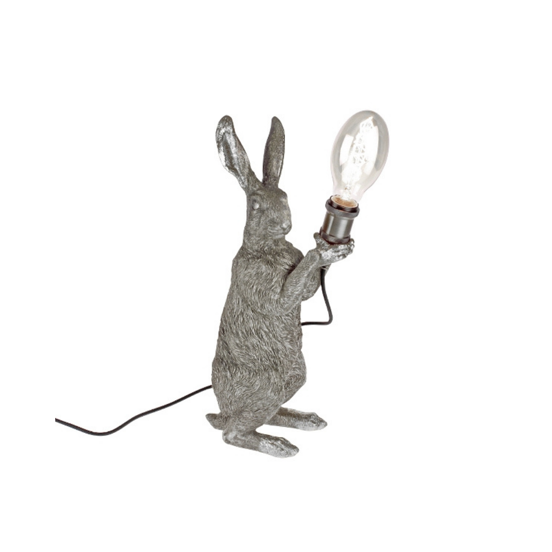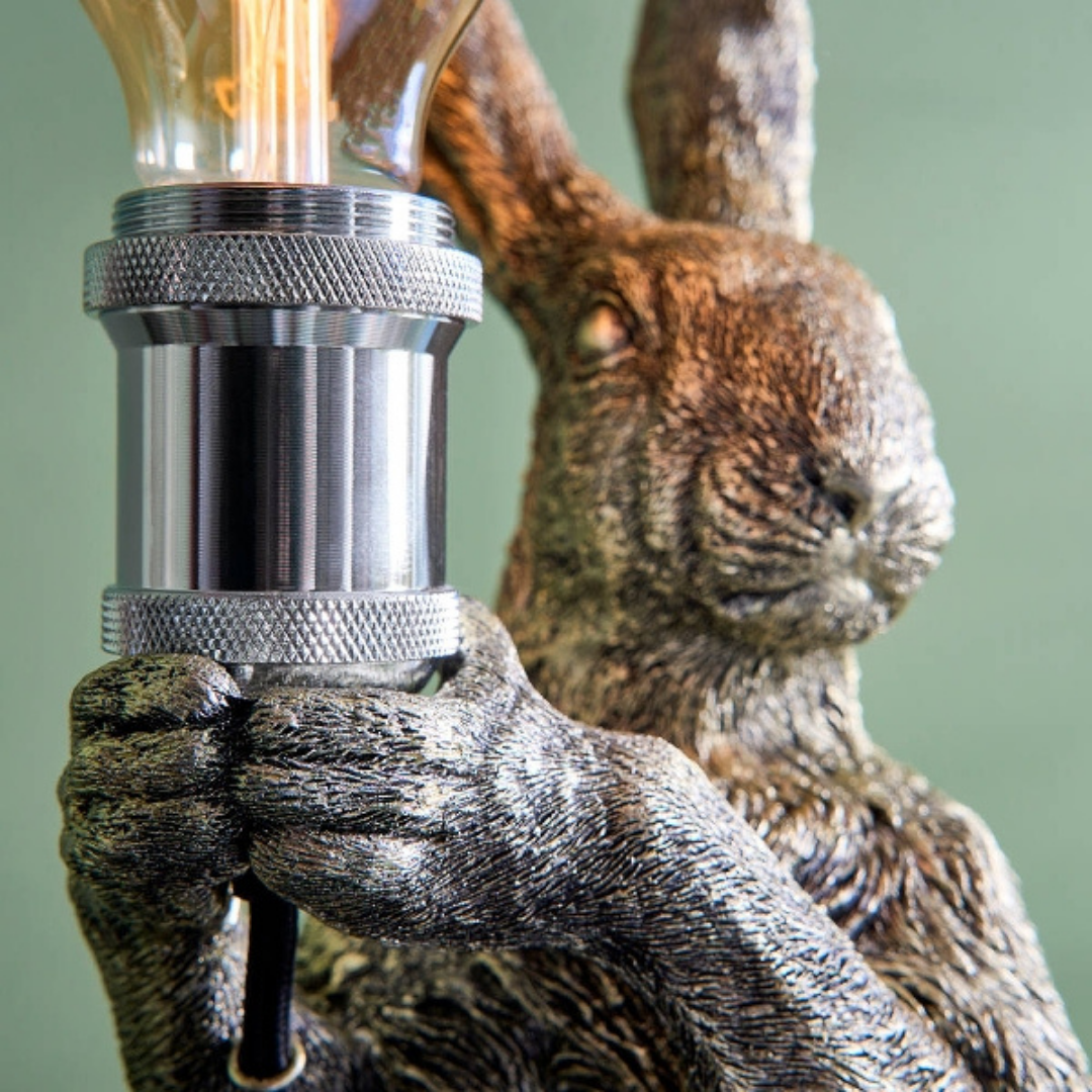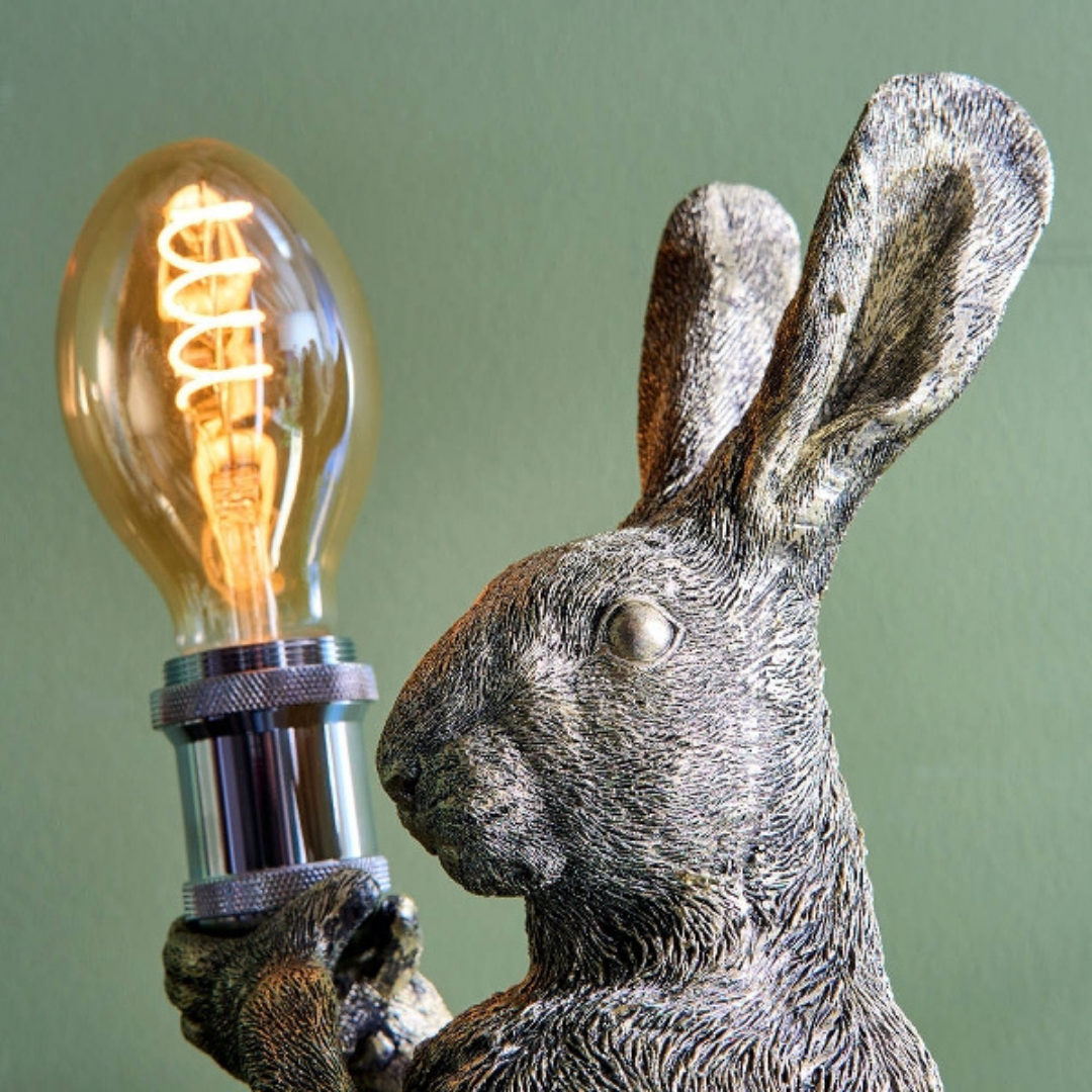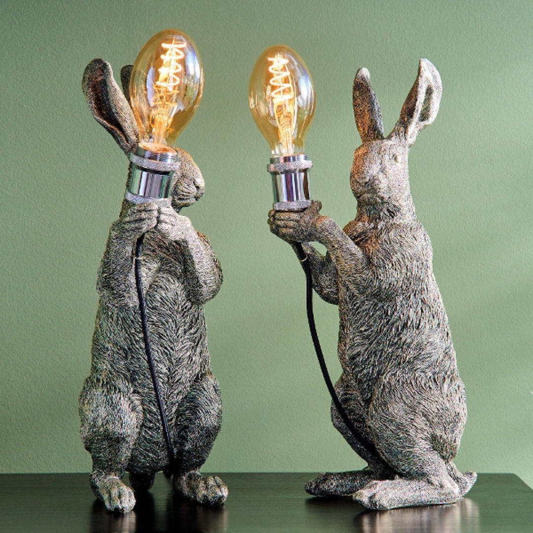 A Meister asztali lámpa egy ötletes és modern világítótest, amely tökéletes kiegészítője, és dísze lehet bármilyen belső térnek. A lámpa műgyantából készült, és egy részletgazdag kialakítású nyulat ábrázol, ami egyedülálló megjelenést kölcsönöz neki. Arany vagy ezüst színekben kapható, így könnyedén illeszkedik a különböző stílusú enteriőrökbe. A 2 méteres kábellel rendelkező termék az izzót nem tartalmazza.