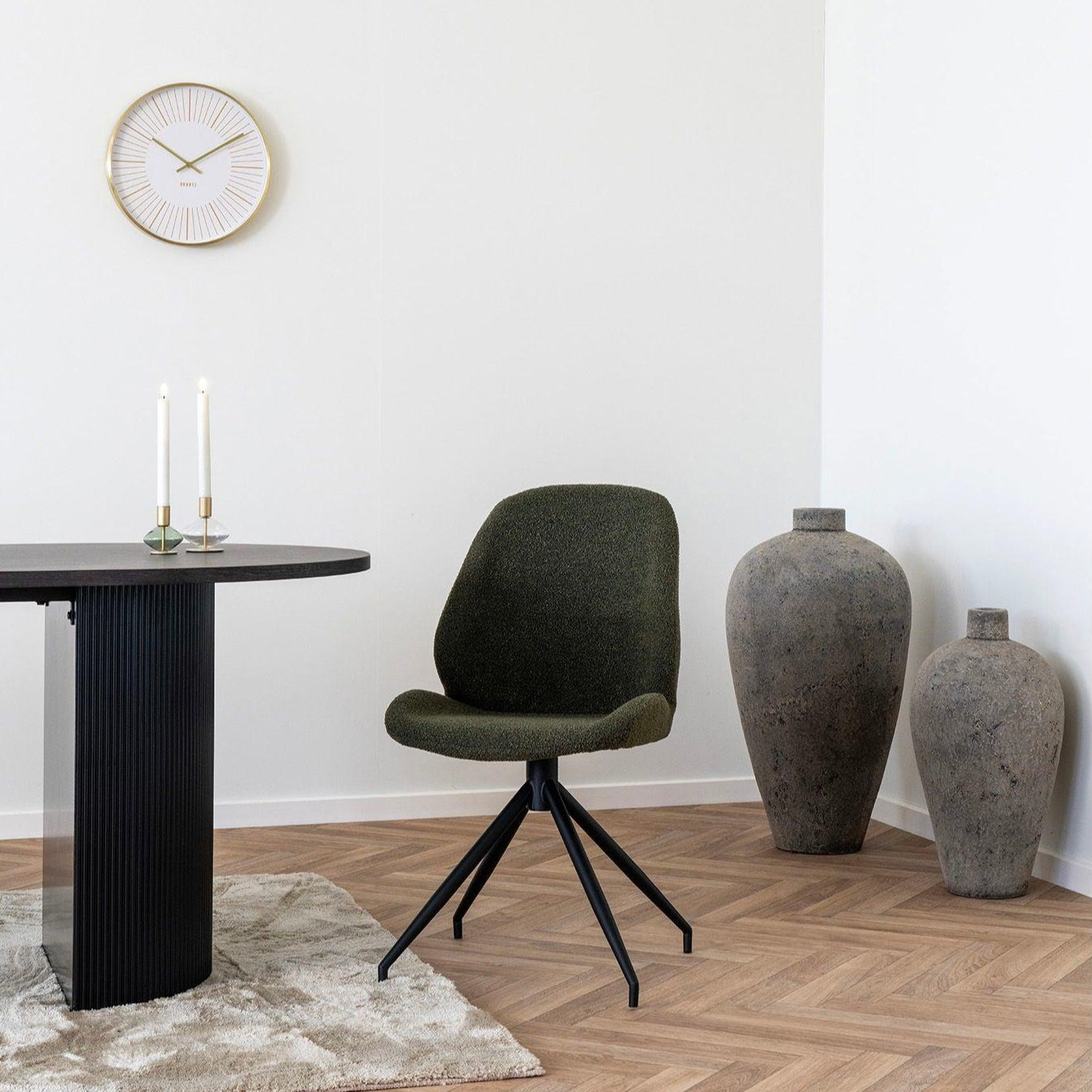 A Monte Carlo forgószék egy elegáns, és praktikus bútordarab, mely sötétzöld vagy fehér buklé huzattal van kárpitozva. A vékony fekete lábak modern megjelenést kölcsönöznek a széknek, miközben a forgó funkció kényelmes használatot biztosít.