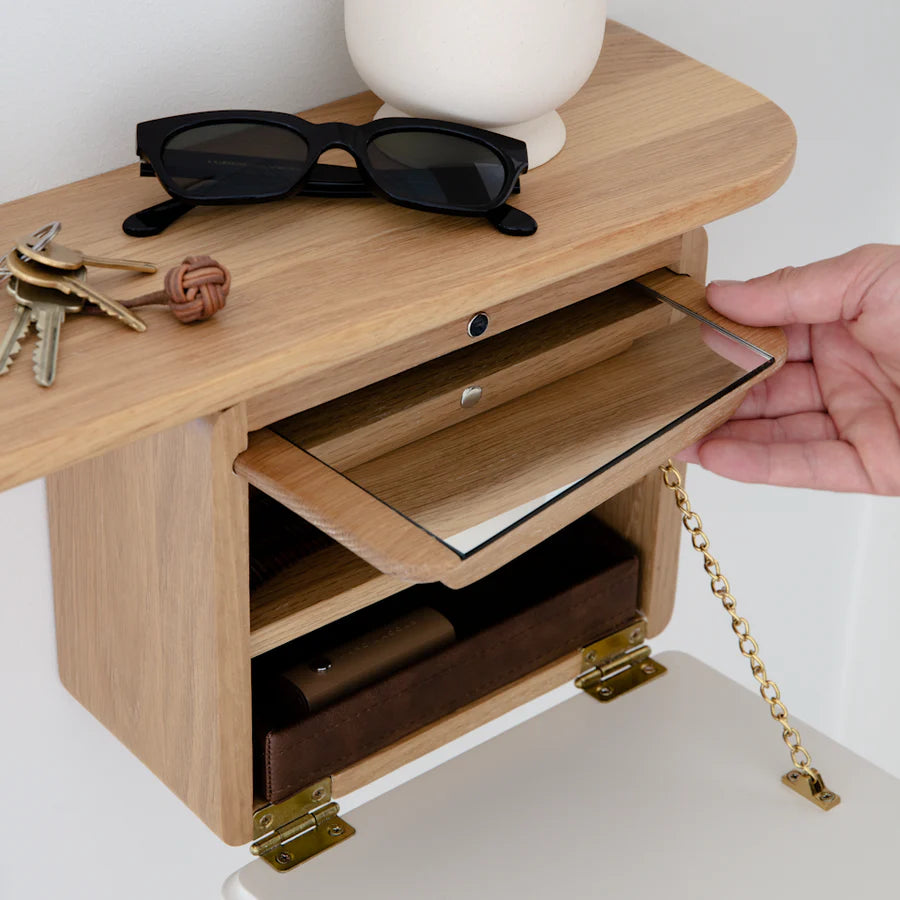 A One More Look egy könnyed és légies tükör, minimalista skandináv hangulattal és számos hozzáadott funkcióval, hogy megfeleljen a városi élet mindennapi igényeinek. A minimális helyet foglaló One More Look ideális minden méretű előszobába, és jól használható a hálószobában vagy szállodákban és irodai folyosókon is. Pontosan a megfelelő magasságával teljes hosszúságú tükörképet kínál a tökéletes utolsó pillantásért, mielőtt elhagyja az otthont. A tükörben egy polc és egy kis szekrény található kézitükörrel és egy bőrtálcával - tökéletes a mindennapi alapvető dolgok, például kulcsok, smink, napszemüveg vagy tartalék érmék tárolására. Akár az a célod, hogy életet lehelj előszobádba, akár az, hogy karaktert adj hálószobádnak, számos lehetőség áll rendelkezésedre. A One More Look-ot úgy tervezték, hogy kiegészítse otthonodat, és olyan teret hozzon létre, ahol az elegancia, a sokoldalúság és a funkcionalitás harmonikusan megfér egymás mellett.