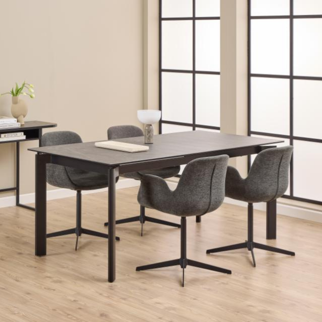 A Palermo étkezőasztal ideális azoknak, akik a stílusra és a praktikumra vágynak. Az egyenes acéllábakkal és karcsú kerámialappal tervezett asztal fekete monokróm megjelenést kölcsönöz, és könnyen karbantartható anyagokból készült. Ez egy olyan kialakítás, amely kellemes a szemnek, és minimálisra csökkenti a karbantartást. Asztallapja 180 cm-ről 240 cm-re bővíthető.