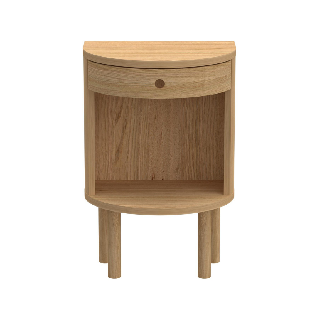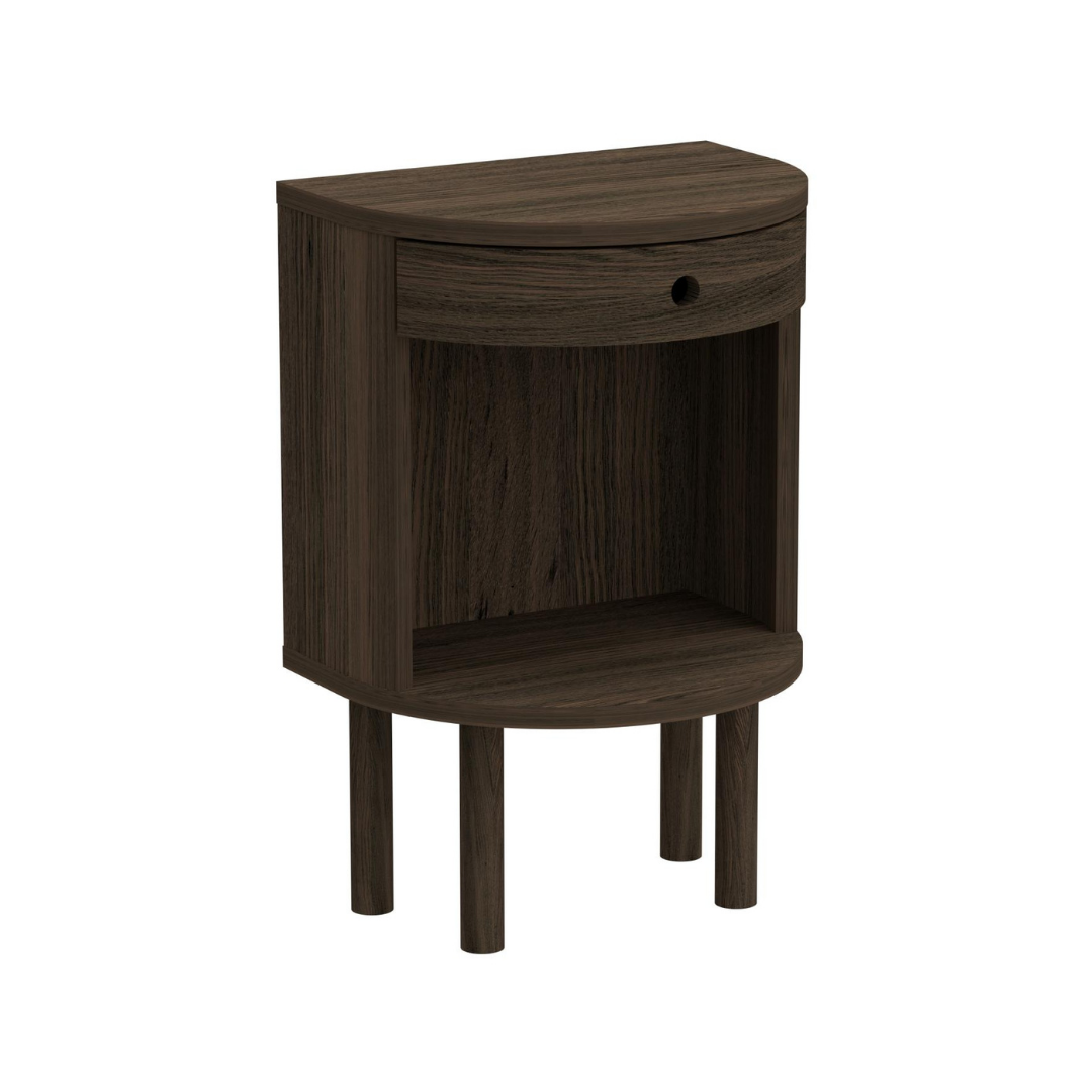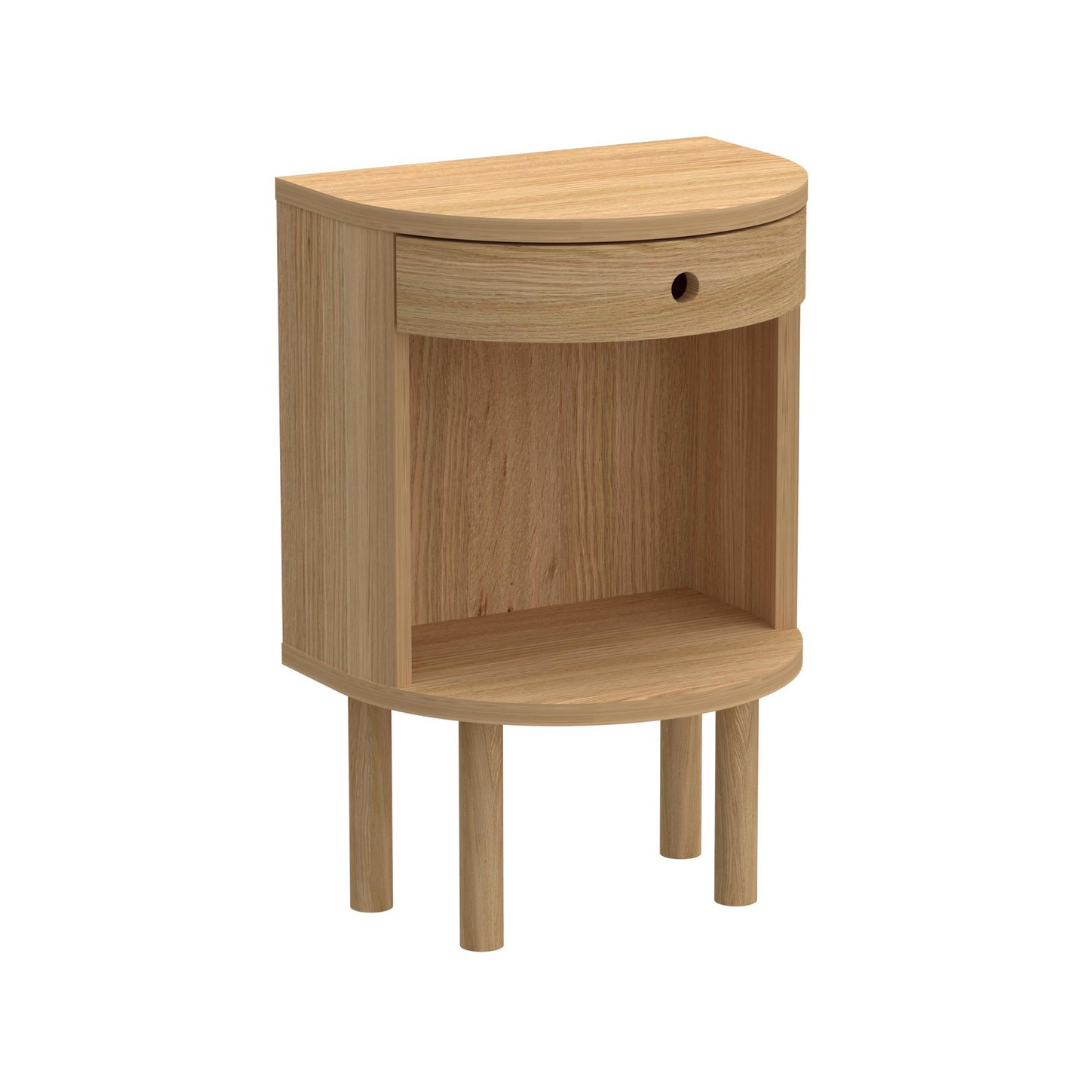 A kétféle kivitelben kapható Paron éjjeliszekrény bármely hálószoba praktikus, és stílusos kiegészítője lehet. Natúr és sötétbarna színekben kapható, így könnyedén illeszkedik a különböző belső terekbe. A kisebb változat egy falra szerelhető fiókos darab, ezt is megtalálod webshopunkban, míg a nagyobb pedig magas lábakon áll. Az íves, félkörös kialakítás biztonságos használatot nyújt.