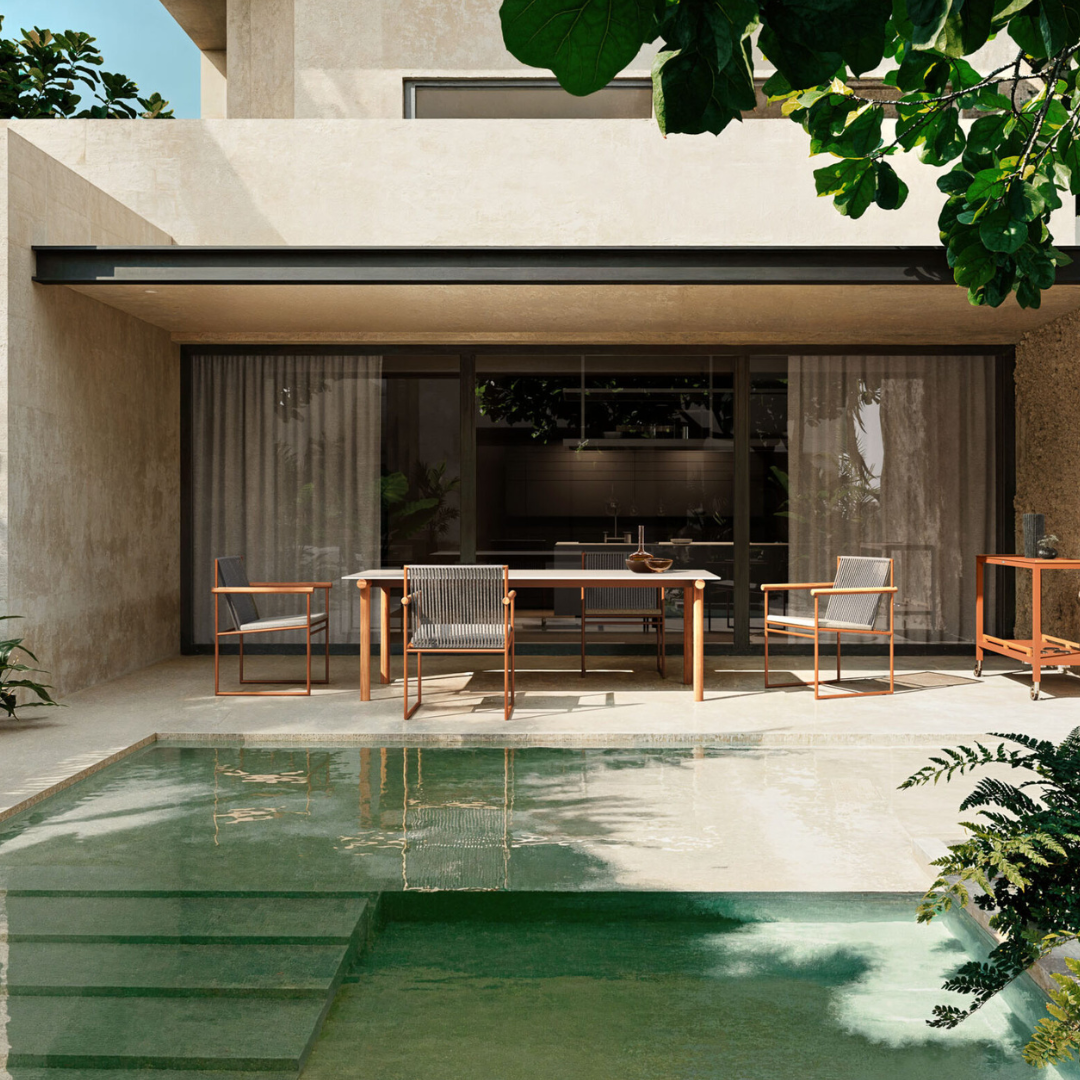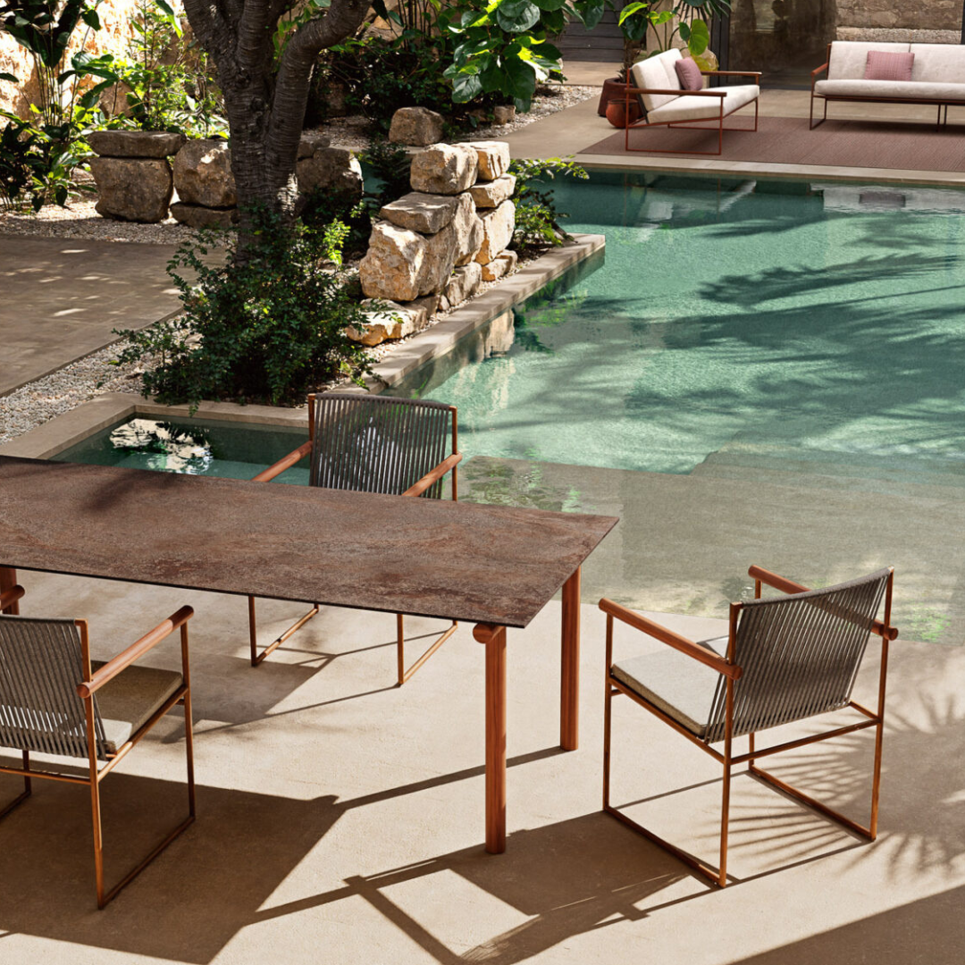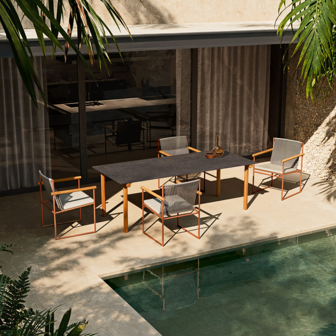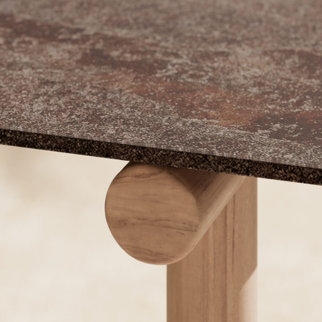 A Pipe étkezőasztalt merész geometriai formák jellemzik, tömör ázsiai teakfából készült csővázas lábakkal, amelyek a robusztusságot és a természetes eleganciát ötvözik. A három különböző kivitelben kapható kőzetlap tartós és könnyen karbantartható felületet kínál, amely egy csipetnyi kifinomultsággal és időtlen stílussal gazdagítja a szobát.