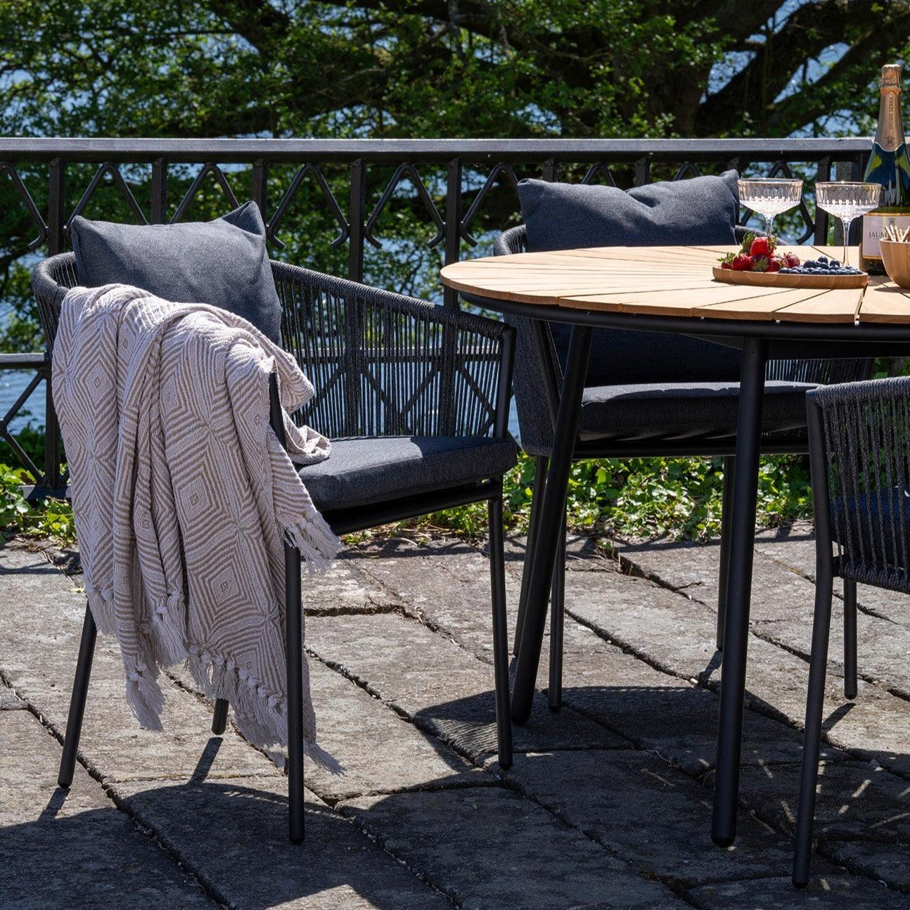 A Salerno fém kerti szék tökéletes választás az étkezőbe vagy a kertbe. A sötétszürke fém váz és a szövet kötél berakás elegáns megjelenést kölcsönöz a széknek. A párnával kényelmes ülőhelyet biztosít, így akár hosszú vacsorák vagy beszélgetések is kényelmesen eltölthetőek. A szék mérete 62 x 59 x 78 cm, így könnyen beilleszthető bármilyen környezetbe.