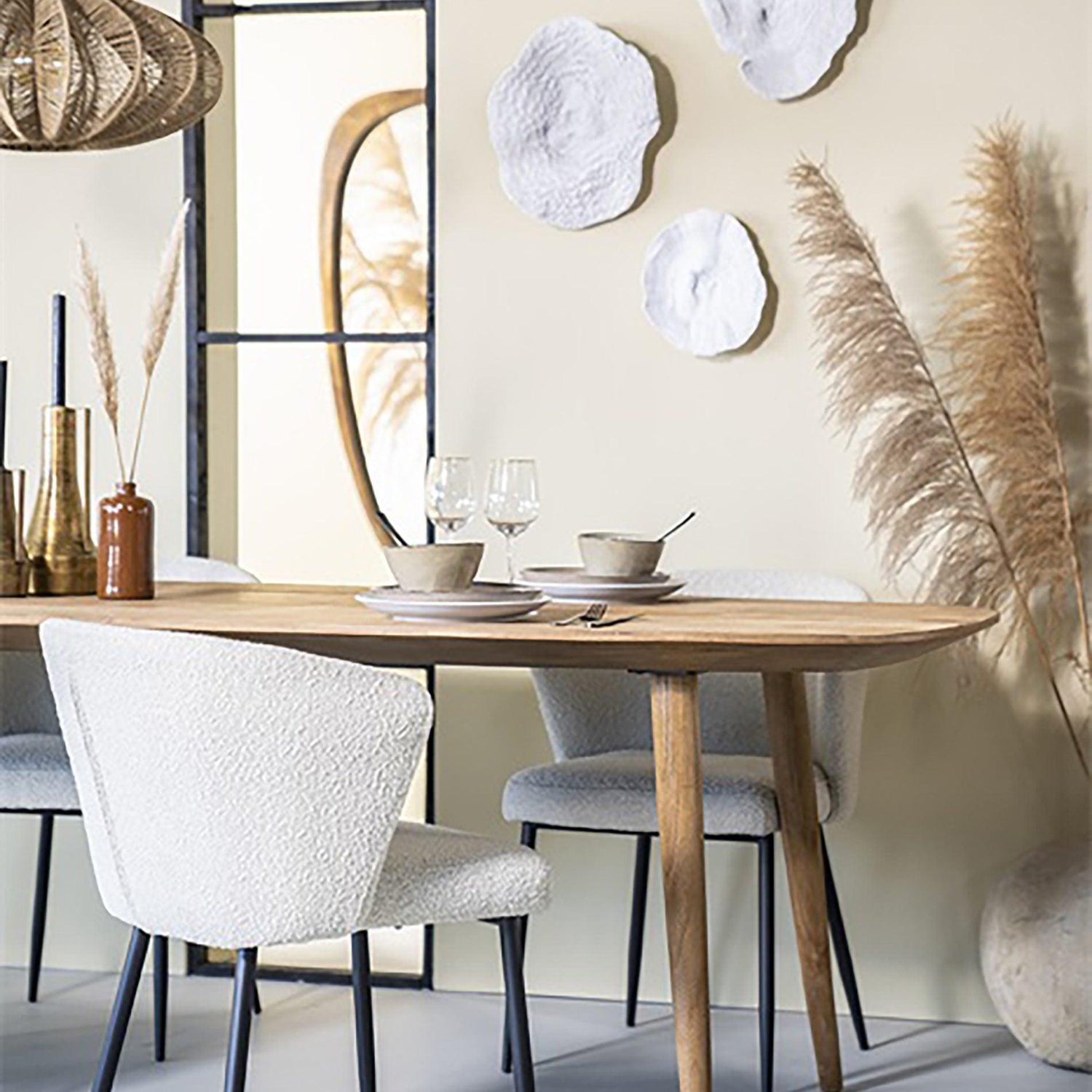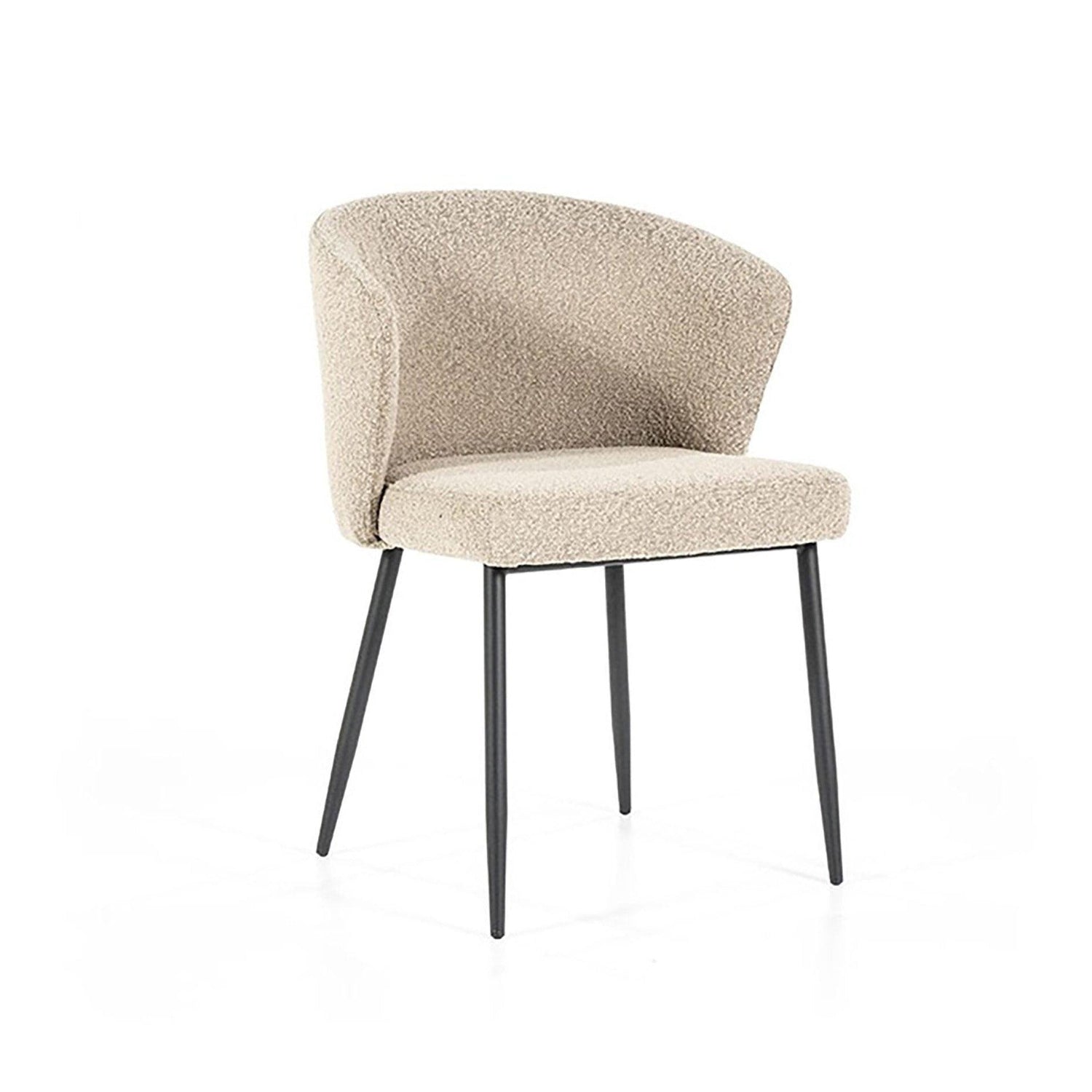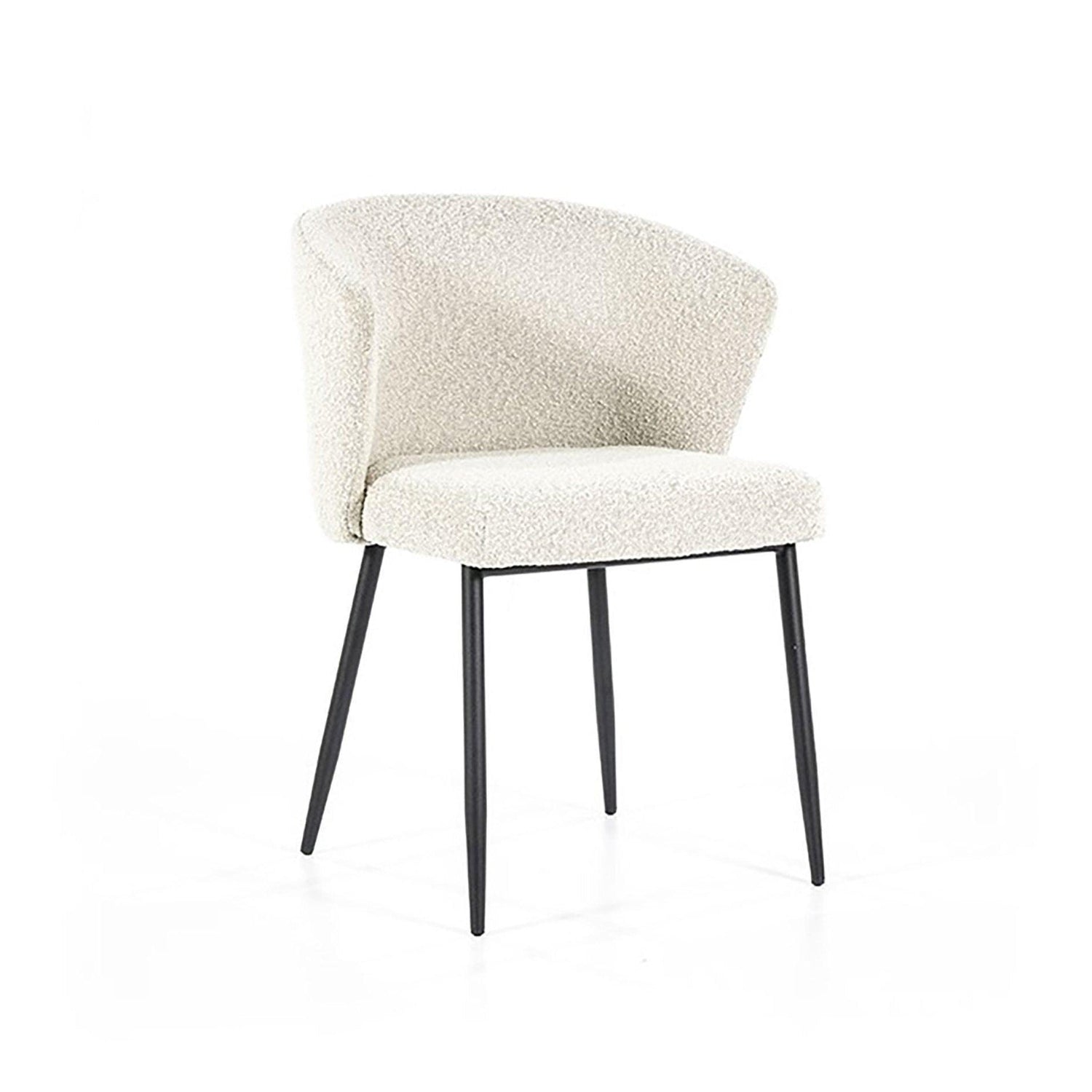 A nagy tehetbírású Santos szék modern megjelenésével bármely szoba kiemelkedő darabja lehet. A kifelé álló, vékony, fekete lábak kontrasztot alkotnak a buklé kárpitozással, a szögletes ívek pedig stílusos hatást keltenek. A félkör alakú háttámlával rendelkező Santos szék fehér, és bézs színekben érhető el.