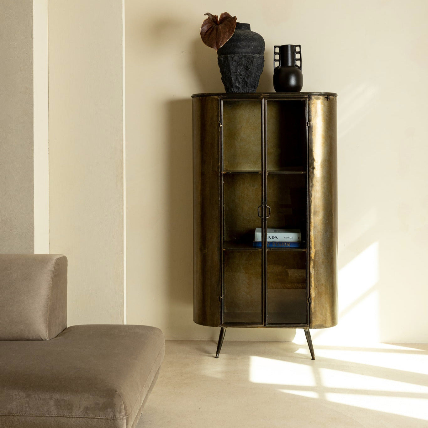 A Spacer kabinet vintage stílusával kiemelkedő darabja lehet otthonodnak. Az antikolt réz színű felületek, az üveg ajtók, és a lekerekített szélek elegáns összhatást keltenek bármely belső térben. A kétféle méretben elérhető Spacer kabinet emellett praktikus tárolóhellyel is szolgál.