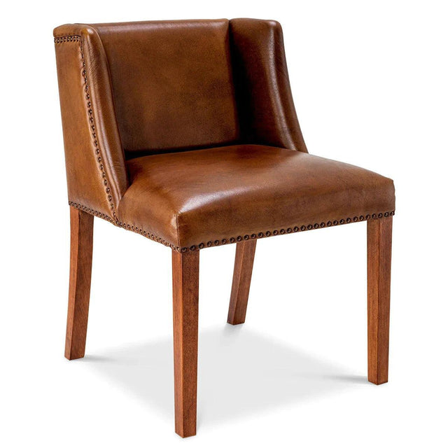 Varázsolj időtlen szépségű ülőgarnitúrát a St. James étkezőszékkel. Tobacco bőr kárpitozása antik sárgaréz szegecsekkel és barna színű fa lábakkal rendelkezik, így ez a szék csodálatosan fog kinézni az étkezőben, legyen szó modern vagy hagyományos enteriőrről.