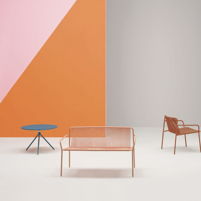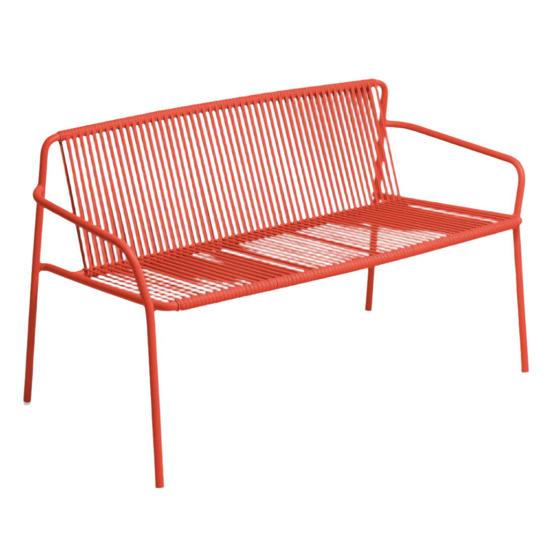 A Tribeca 2 személyes kerti kanapé a klasszikus hatvanas évek acélból és szövött anyagból készült teraszszékeinek modern újraértelmezésével repít vissza minket az időben. A kanapé a porszórt fém felületei, és a szőtt PVC anyaga miatt tökéletes a kültéri használatra.