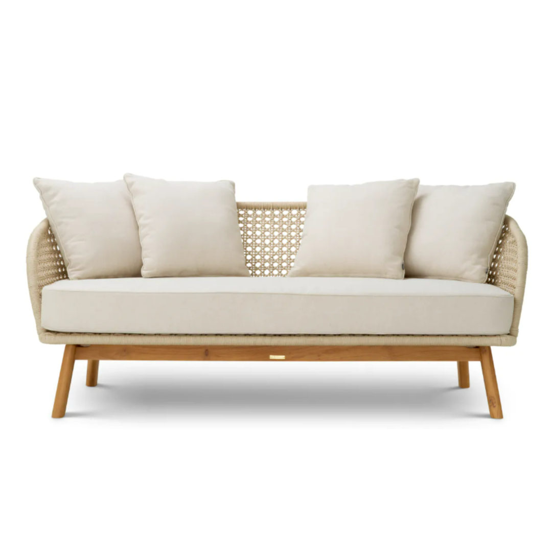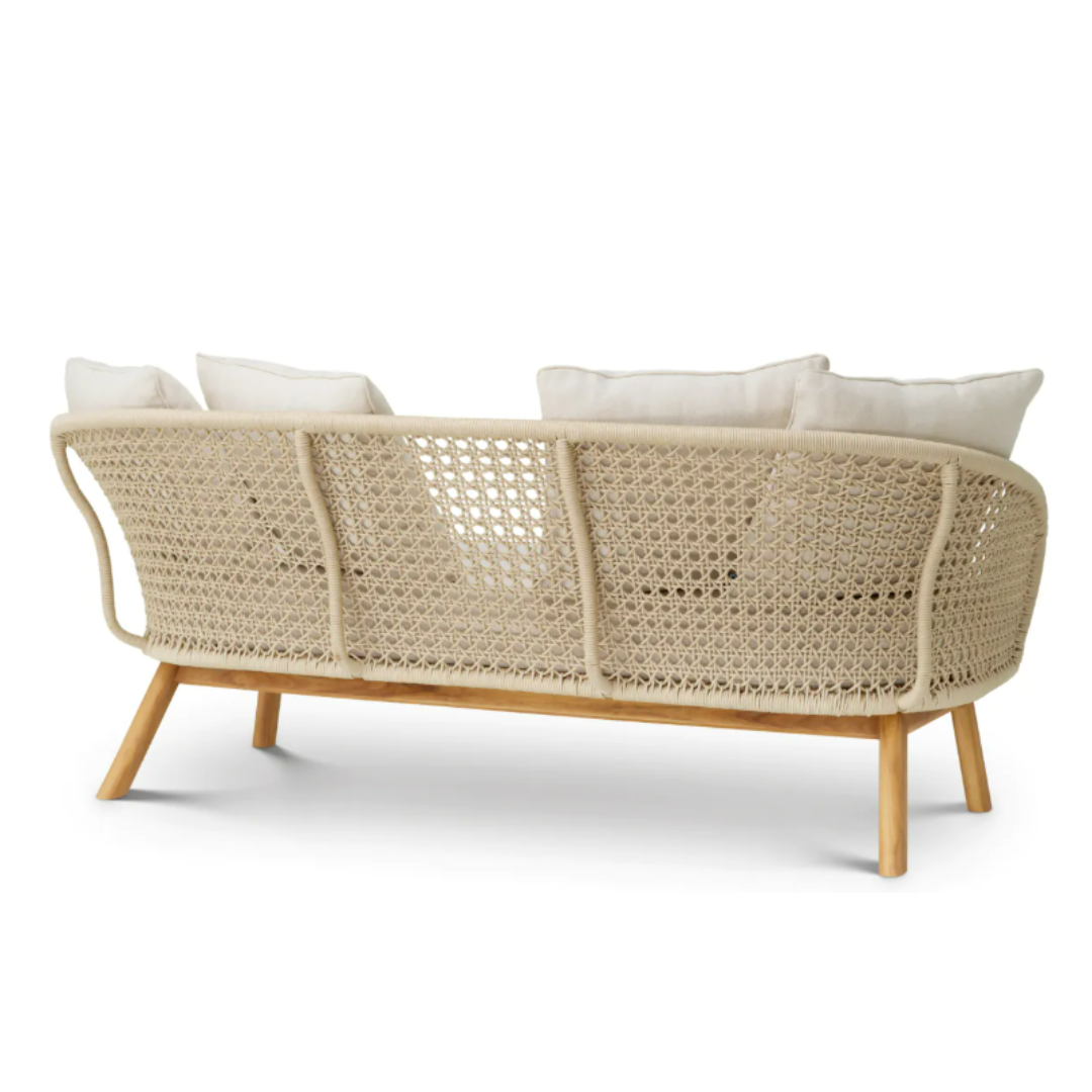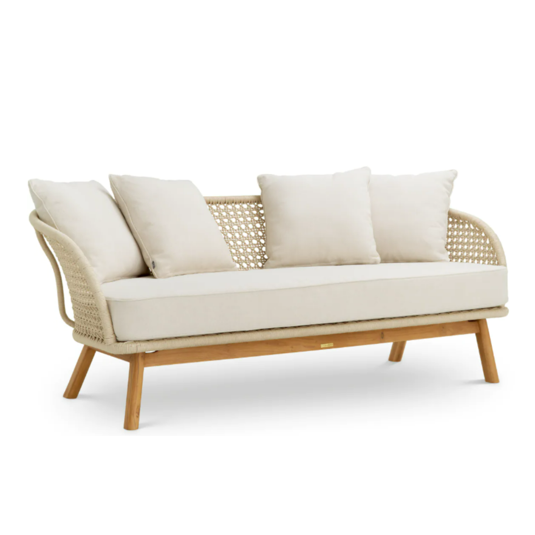 Fogadd be a páratlan kifinomultságot a Trinity kültéri kanapéval. Ez a fényűző darab Flores törtfehér kárpitozással rendelkezik, amelyet kecsesen körbeölel a krémszínű kötélből készült háttámla és az elegáns természetes teakfa lábazat. Kifinomult kialakítása és plüsspárnái valódi pompát kínálnak, és nyugodt pihenésre invitálnak. Tökéletes azok számára, akik az időtlen szépséget és a legmagasabb szintű kényelmet keresik szabadtéri oázisukban.