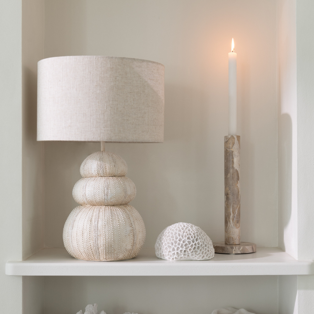 Az Urchin asztali lámpa a modern elegancia és a minimalista stílus tökéletes kombinációját nyújtja. A termék finom, bézs színű szövet búrája lágy, diffúz fényt biztosít, amely barátságos hangulatot teremt bármely térben. A lámpatest műgyanta anyagból készült, ami részletgazdag kidolgozású, egymásra helyezett tengeri sünöket formáz meg, ezzel természetes megjelenést biztosít. A 155 cm-es kábellel rendelkező termék az izzót nem tartalmazza.