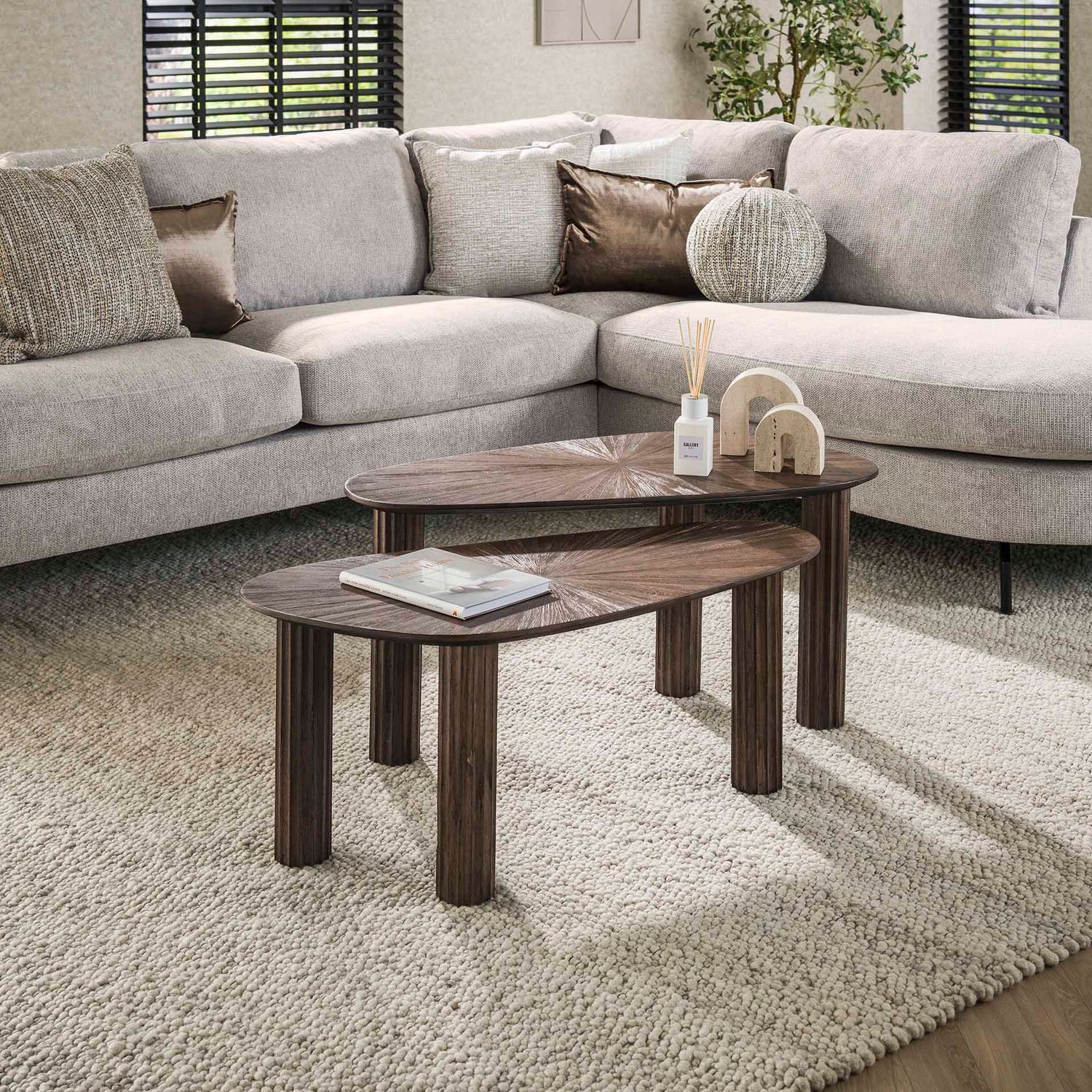 A Zistra 095 dohányzóasztal szett két, különböző méretű darabból áll, így használhatóak együtt, vagy akár külön-külön is. A sötétbarna, sugár irányú mintázattal ellátott aszimmetrikus asztallapot bordázott, henger alakú lábak egészítik ki, ezzel egyedülálló stílust kölcsönöz. Elegáns, és modern megjelenése miatt könnyedén illeszkedik minden enteriőrbe.