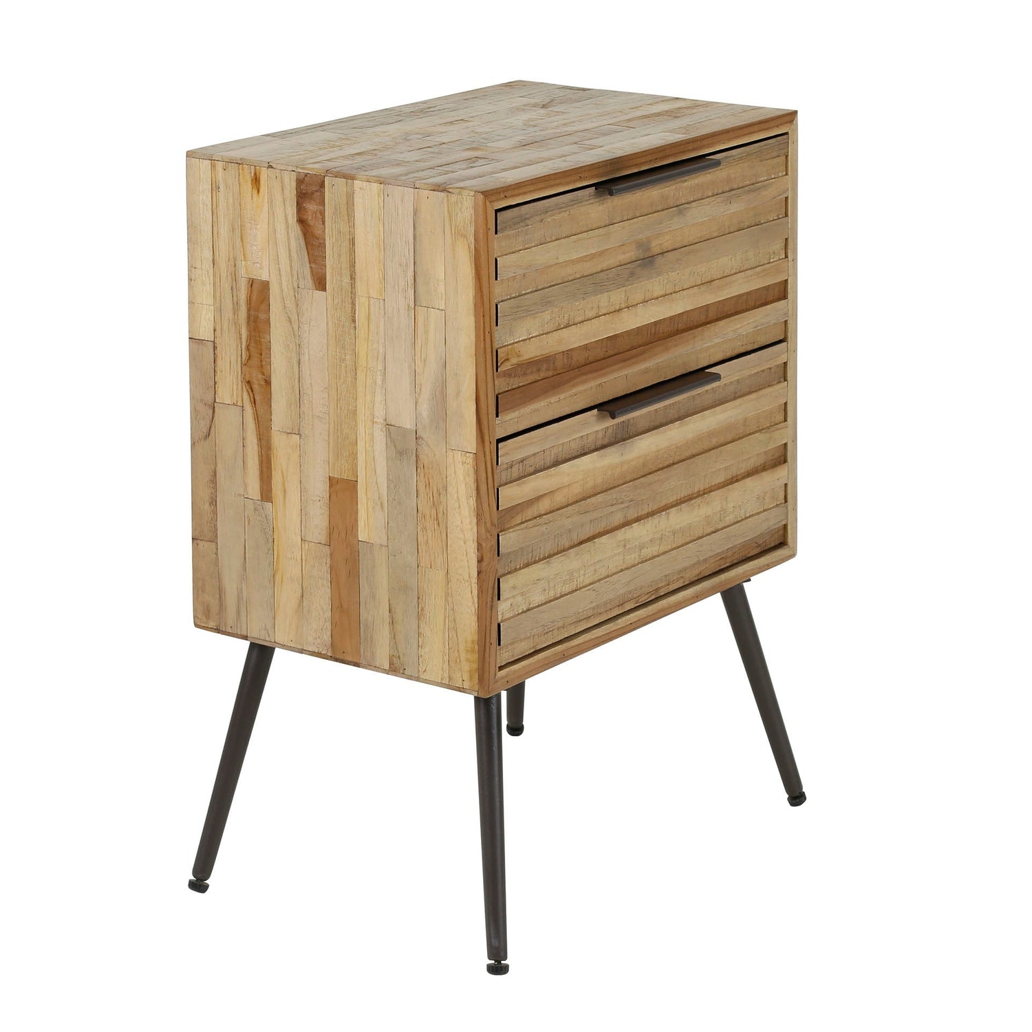 A Zistra 237 éjjeliszekrény egy modern megjelenésű bútordarab, amely natúr színű tíkfából készült, és csíkos, parketta mintázattal rendelkezik. A vékony, kifele álló fekete fém lábak könnyed hatást kölcsönöznek, miközben stabil alapot nyújtanak. A két fiók, és az asztallap pedig elegendő tárolási lehetőséget biztosít.